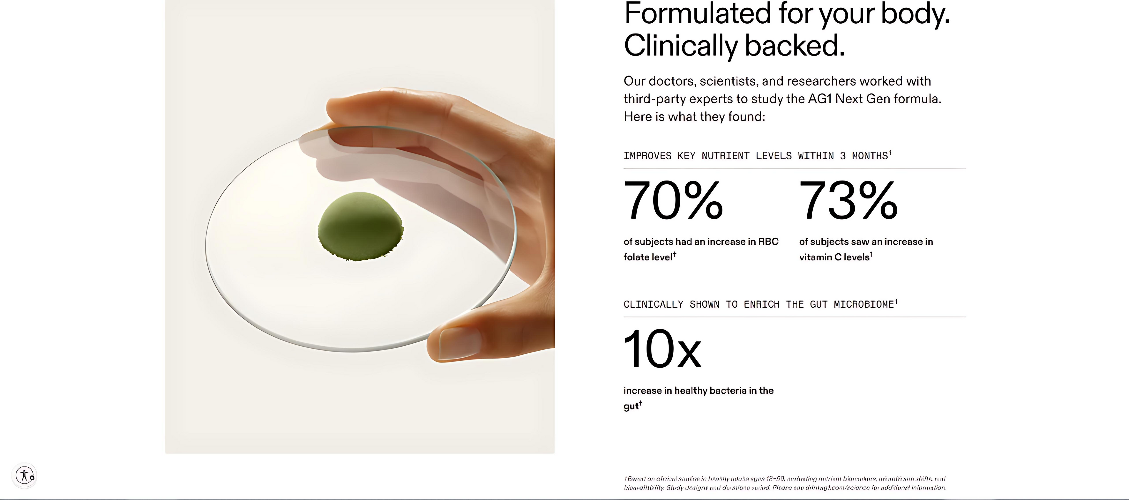 - Multiple gold-standard clinical trials that consistently show AG1 Next Gen helps fill nutrient gaps across a range of lifestyles and diets (1-4).